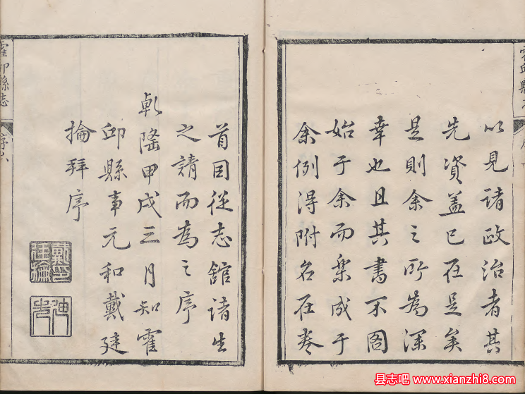 霍邱县志十二卷清乾隆十九年刊本。清张海修,薛观光纂。海字巨川,浙江钱塘县人;乾隆十六年由霍邱县丞升知县。观光字上宾,号云楼,长洲人;乾隆甲子科解元,十八年任霍邱县教谕。梁置霍邱戍,隋改为县。明万历二十四年知县杨其善修志十卷;清顺治乙未又重辑志稿,康熙庚戌知县姬之簋始重辑刻成县志十卷。此志继《姬志》重纂,为邑士刘始兴、葛铣裔所采辑,经观光总核订定,至乾隆甲戌,知县戴廷榆为之付梓。其书总分礼、乐、射、御、书、数六部,列图考、舆地、建置、食货、学校、人物、艺文、杂记八门,各系子目。
